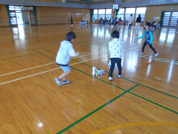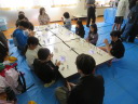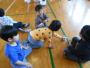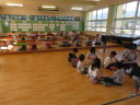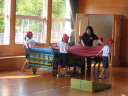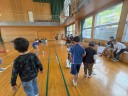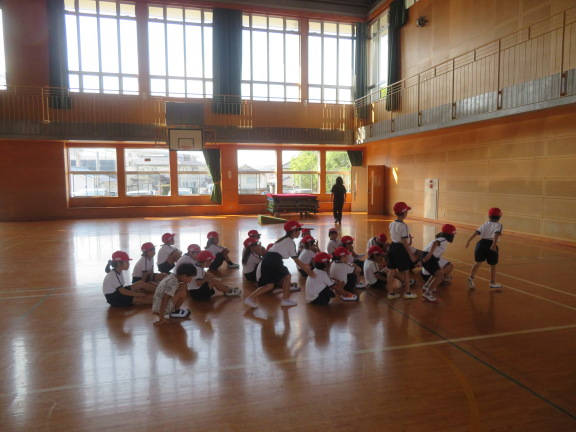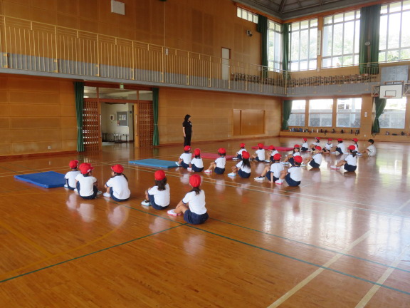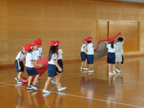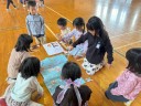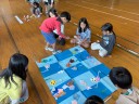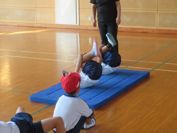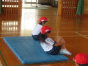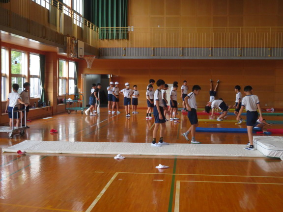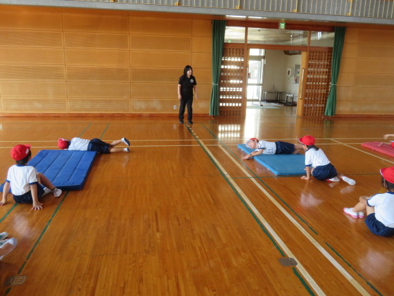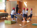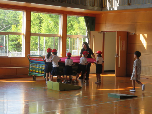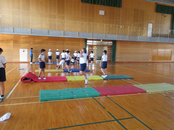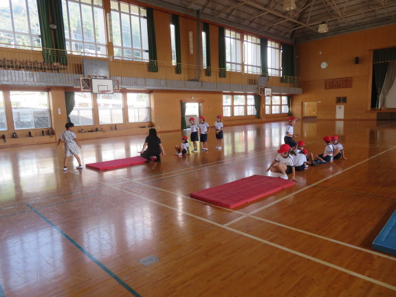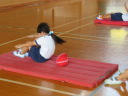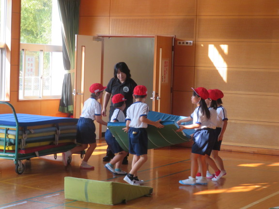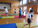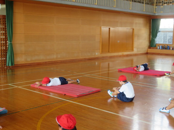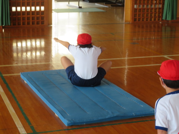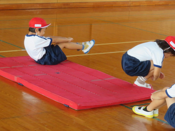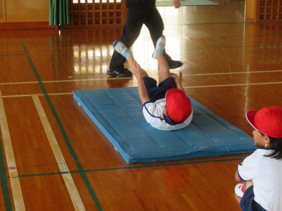 最初に、マットを準備しています。マットは重いのですが、みんなで周りをとり囲み、協力して運んでいました。その後は、横になって回転したり、起き上がりを繰り返したり、前回りしたりして運動していました。みんなずいぶん上手になりました。