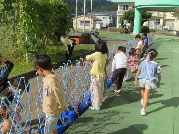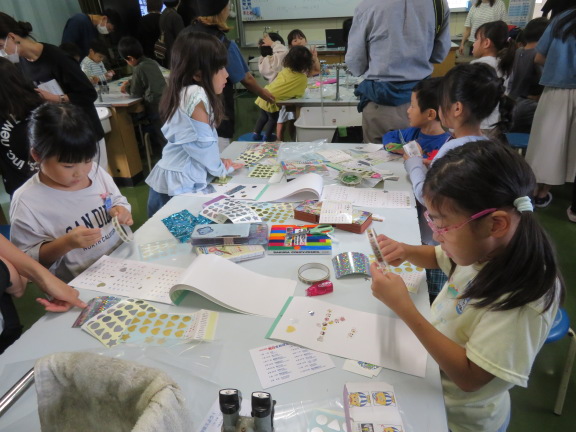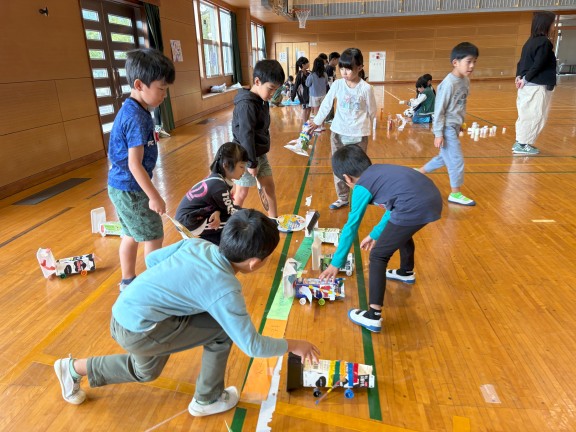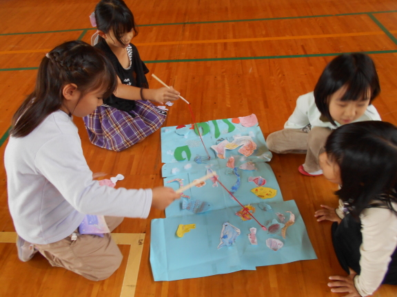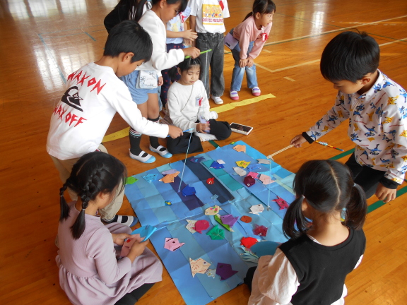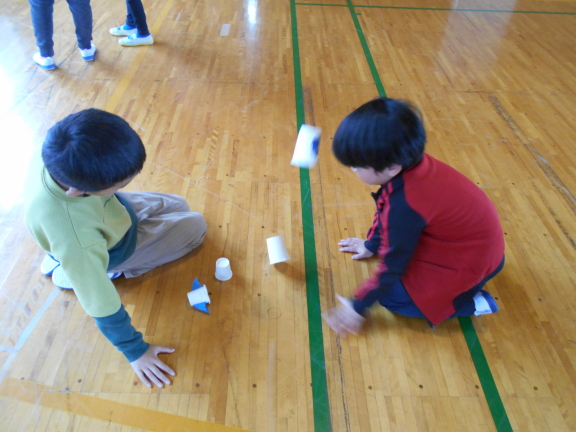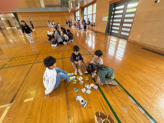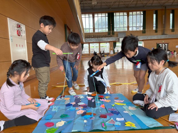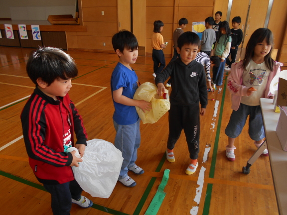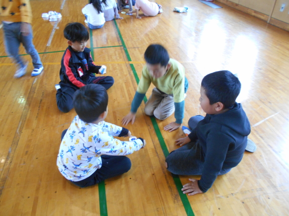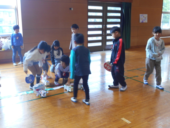 2年生が「おもちゃ広場」を開催し、1年生を招待して一緒に遊んでいます。