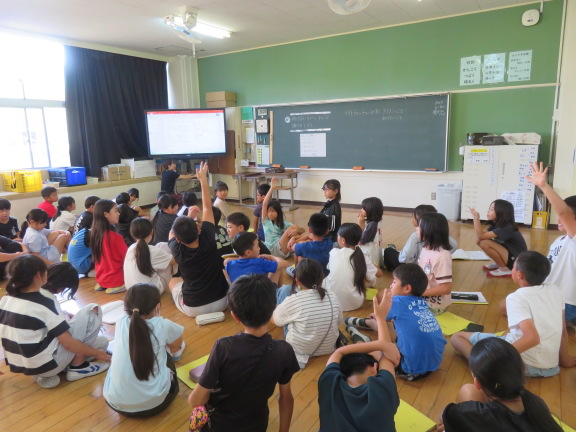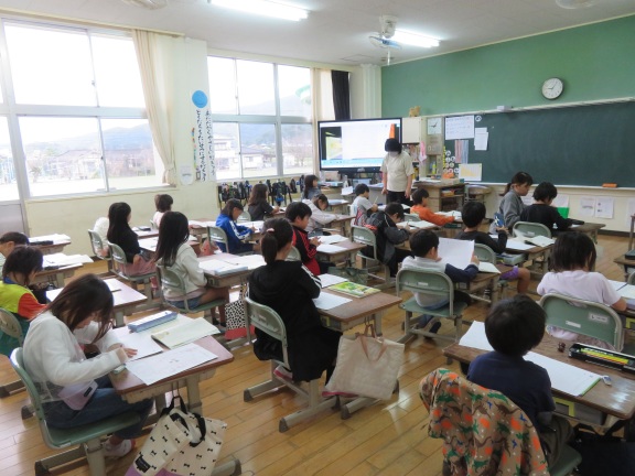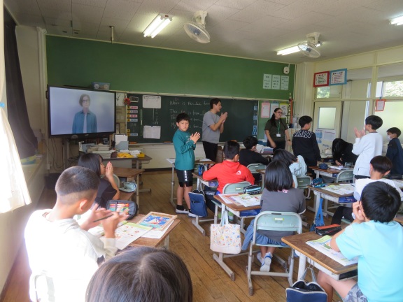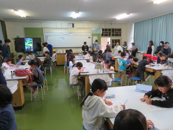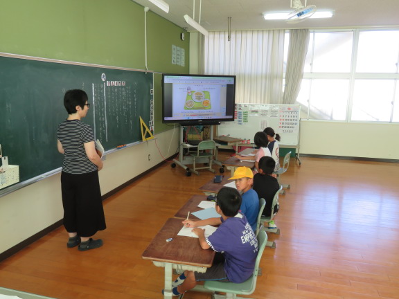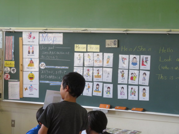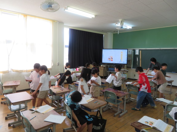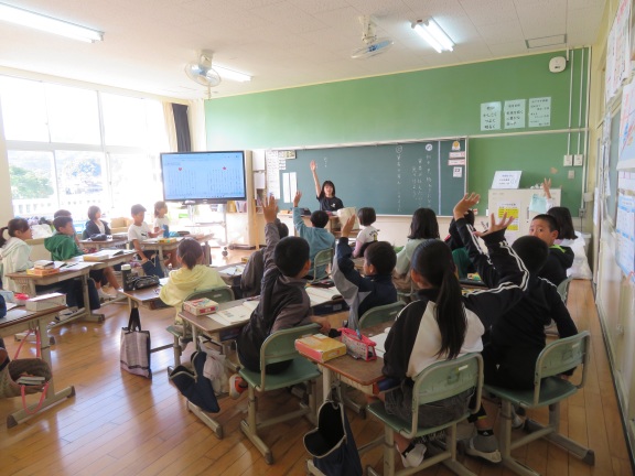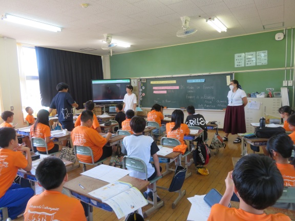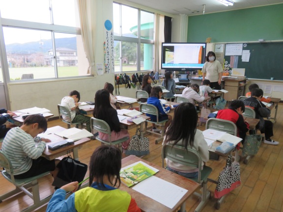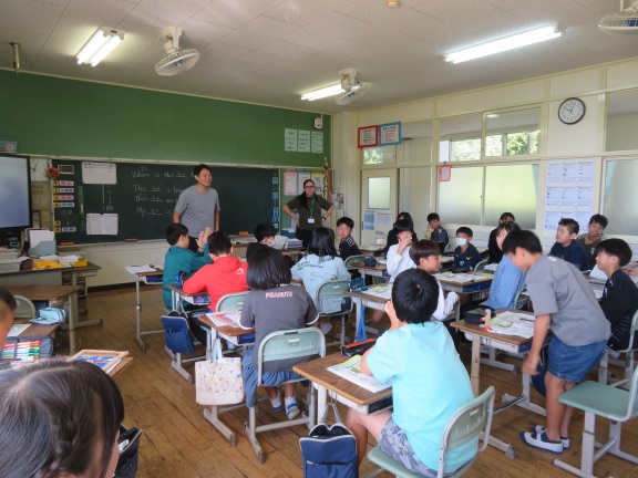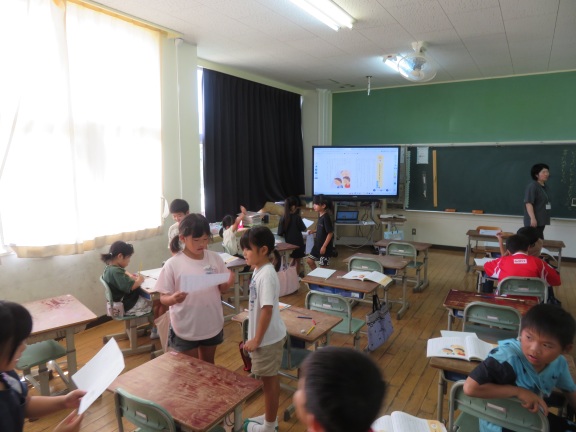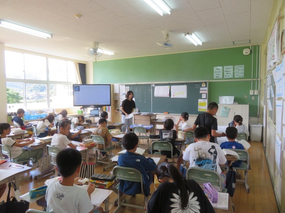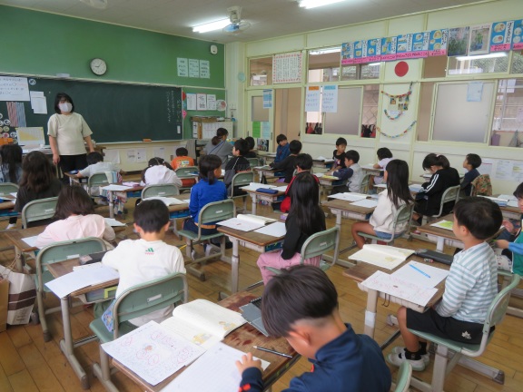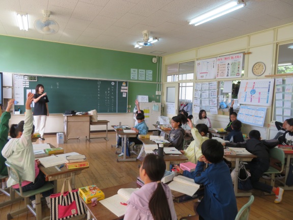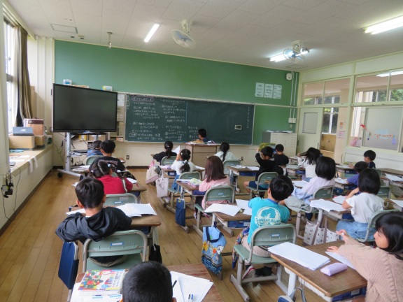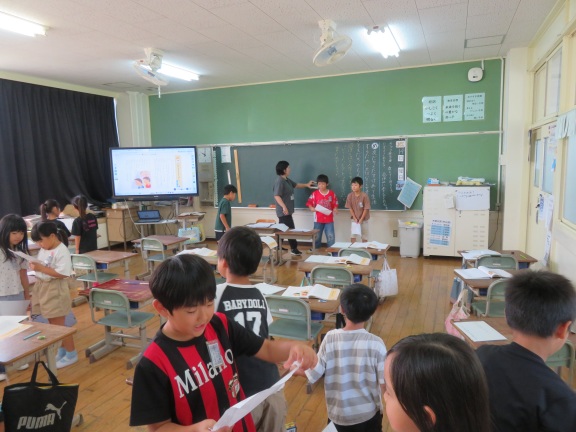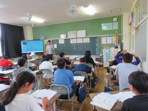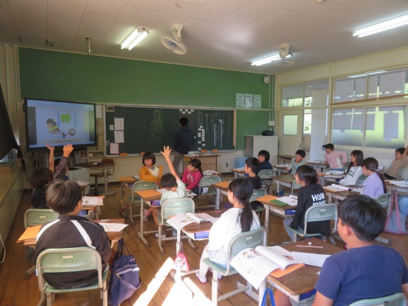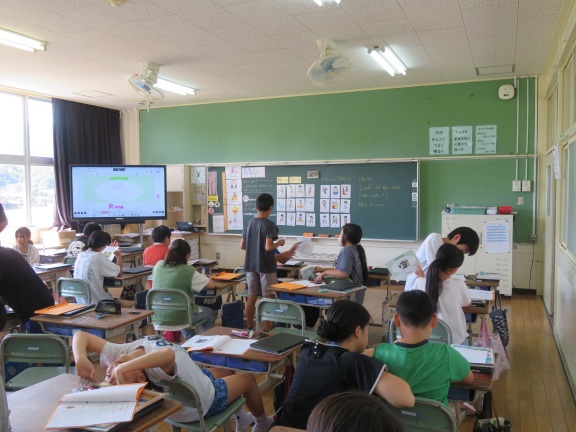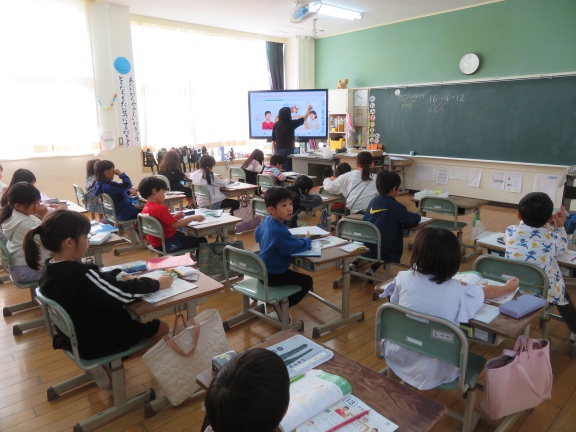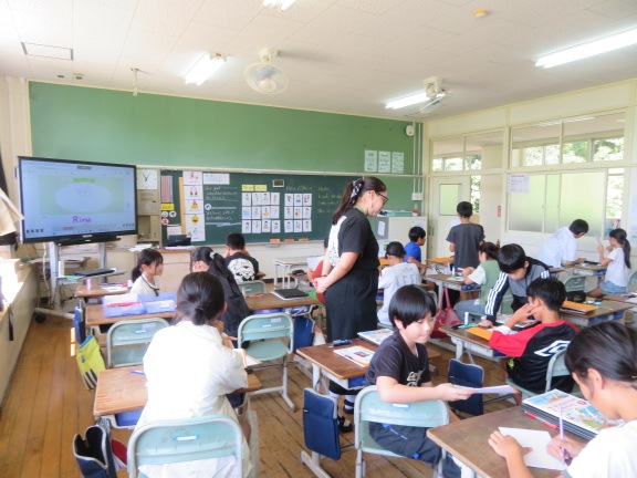 この日は、研究授業として公開し、町内の英語・外国語関係の先生方が参観されました。たくさんの参観者に囲まれながらも、子どもたちは普段と変わらず明るく元気に活動していました。