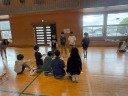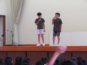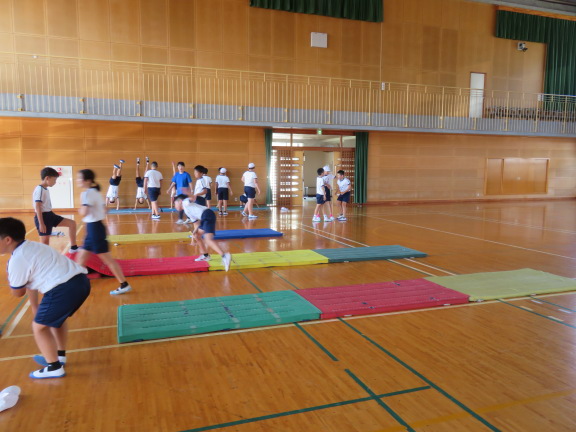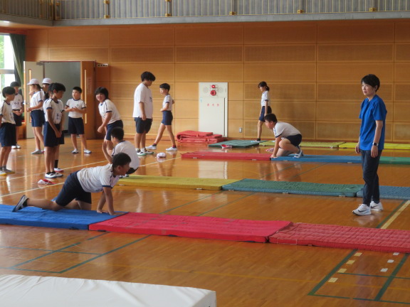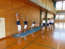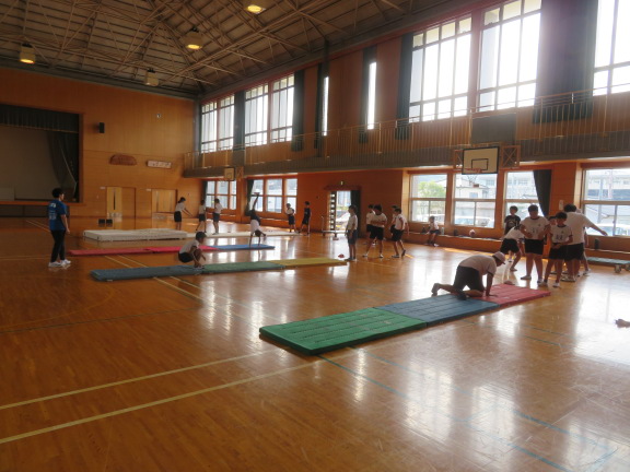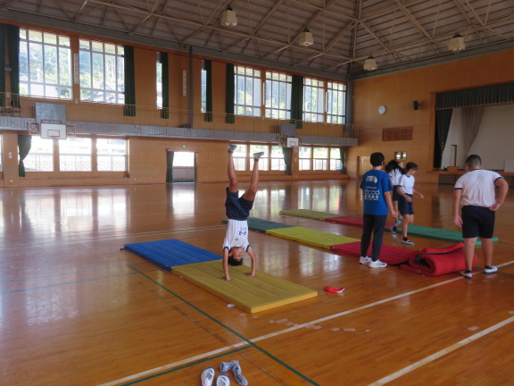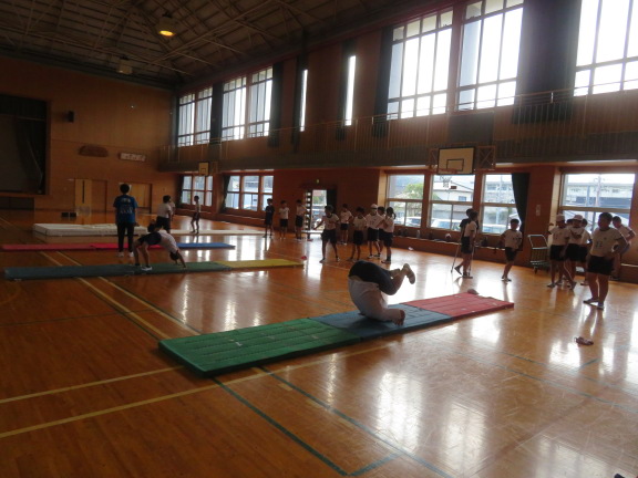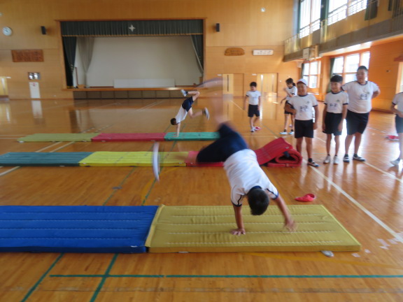 練習の後は、前転、後転、開脚後転、側転、倒立前転など、自分ができる技を互いに披露していました。