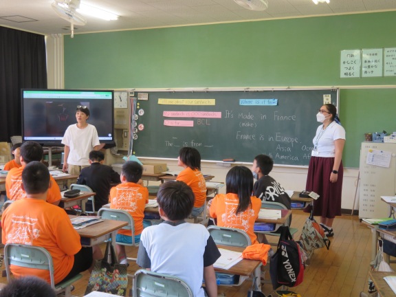 それから「フランス製だよ」「フランスはヨーロッパにあるんだ」などと英語で続けます。持ち物やTシャツなどを使いながら、英語で会話を楽しんでいました。