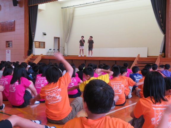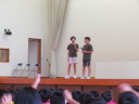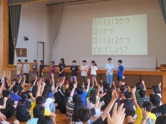 図書委員会の子どもたちが、本の題名や蔵書数などのクイズを出したり、他読者への商品を紹介したりしながら、楽しい時間を過ごしました。