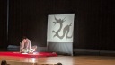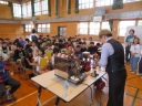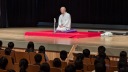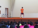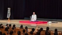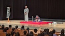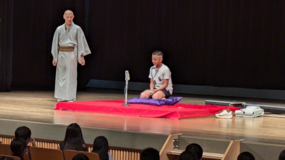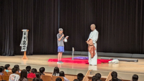 今日の午後は青少年劇場でした。総合文化会館に町内3小学校の4年生以上が集まり、落語を参観しました。落語とはどんなものなのかの基本的な説明や参観の仕方などの話を受けた後、実際に落語を聞いたり、切り絵を見せていただいたりしました。