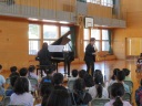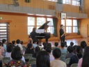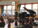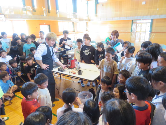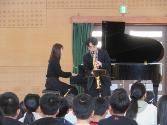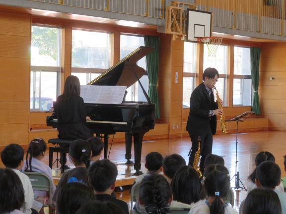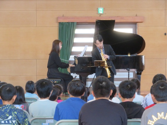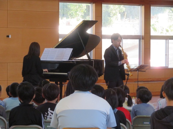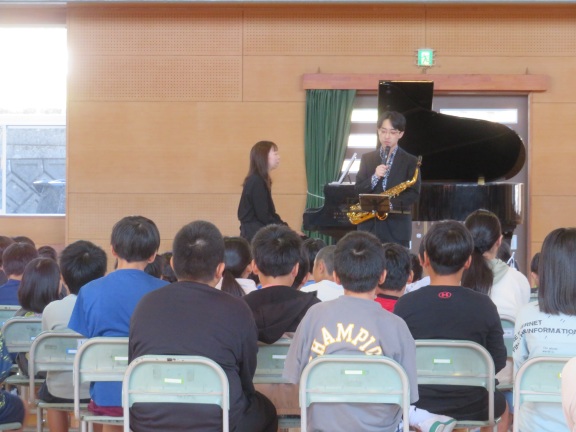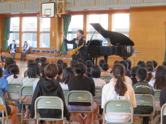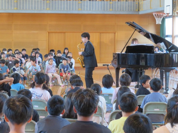 第1部は本校の卒業生であり、プロのサキソフォーン演奏者であられる方をお招きし、コンサートを開催していただきました。第2部は、町内や県内の企業の皆様にブースを出展いただき、子どもたちに体験をさせていただきました。
