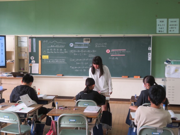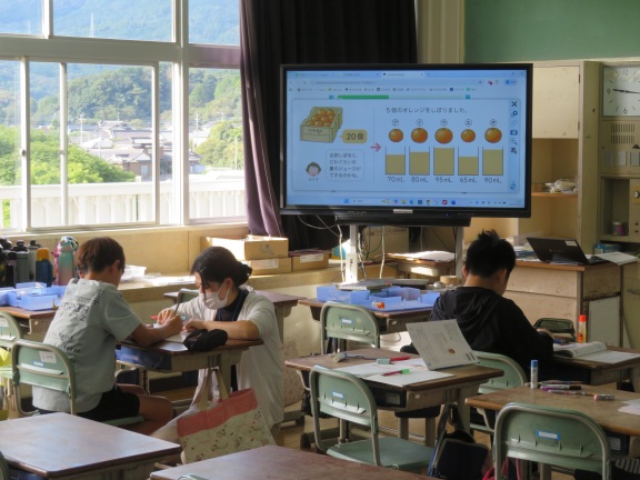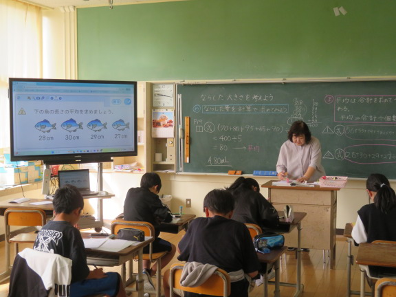 平均を求める学習です。5年生全体を3つにグループに分けて授業を行っています。