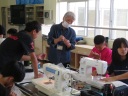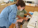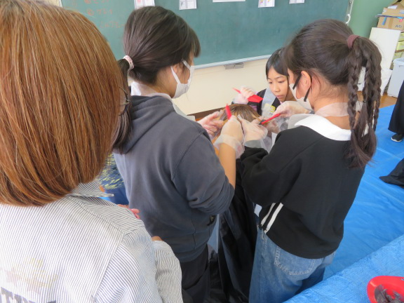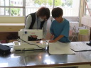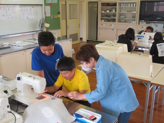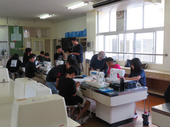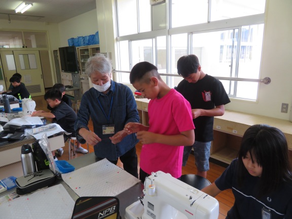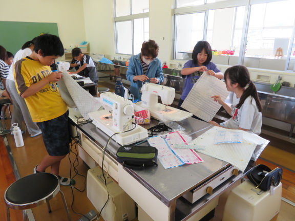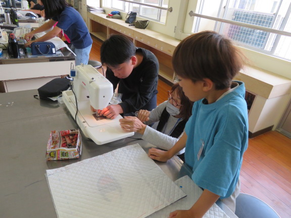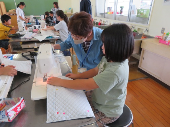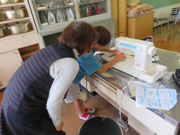 内容は、ミシンを使った裁縫です。普段使うことのない子どもにとって、ミシンを使うことはなかなか難しいものです。そんな子どもたちを支援するために、今日は町内の婦人会から3名の方がゲストティーチャーとして来校くださいました。さすが婦人会の皆さんです。子どもの困った事に応じて、ていねいに分かりやすく支援いただき、学習がスムーズに進みました。