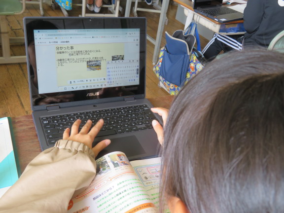 部品はどこから来ているのかや製造の工夫などをタブレットを用いて調べ、まとめたことをまたタブレット上で友達と共有します。