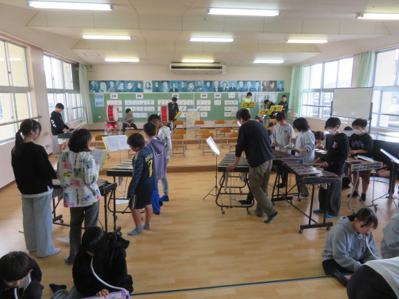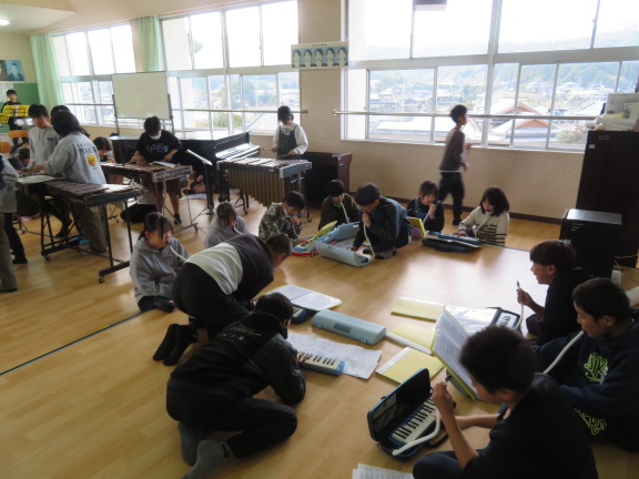 練習しているのは校歌です。大太鼓、小太鼓、木琴、鍵盤ハーモニカなど、各パートに分かれて練習していました。