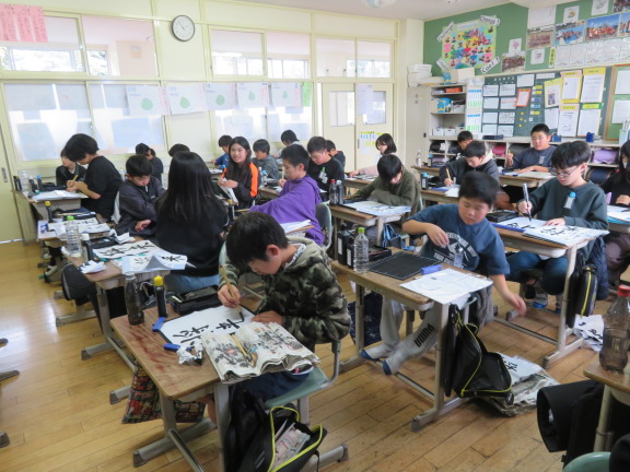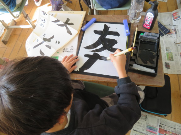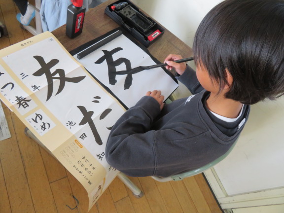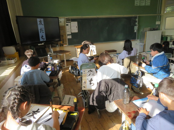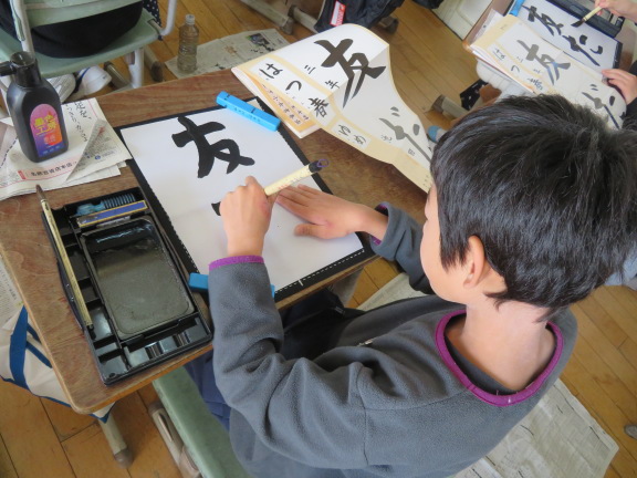 この時間は、3学期の書き初め大会で条幅紙に書く「友だち」の字を練習していました。1時間目は人権集会でしたので、友達の大切さを考えながら書いていました。