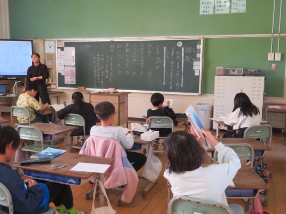 短歌の学習です。5・7・5・7・7のリズムになっていることや、短歌に表されている情景などについて学びをを深めていました。
