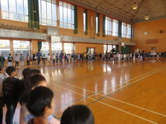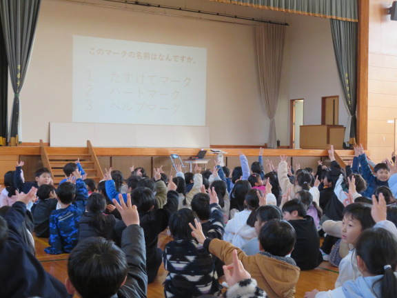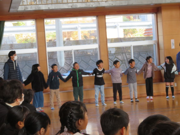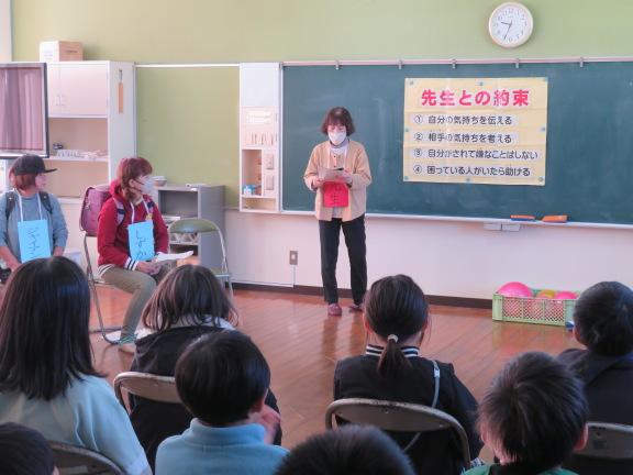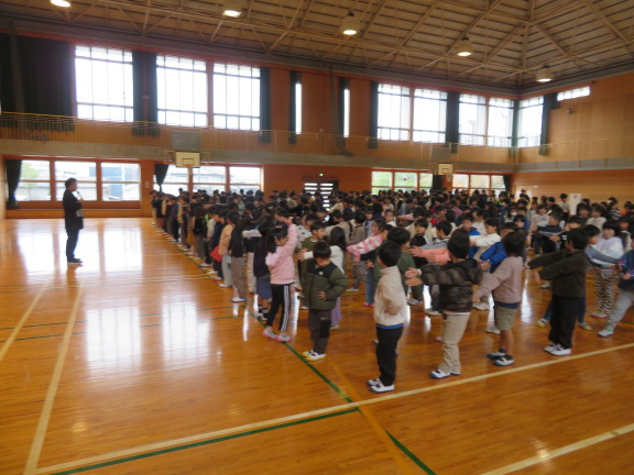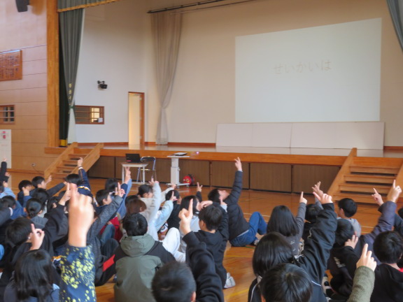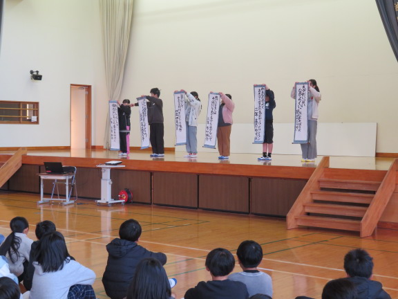 校長の話、各クラスの人権目標の発表、人権標語の入選作品の発表、人権に関するクイズ、絵本の読み語りなどを行いました。最後は全校で輪になり合唱しました。
