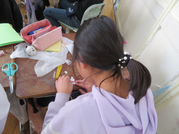 針と糸を使って集中して作業していました。