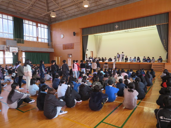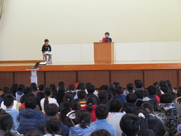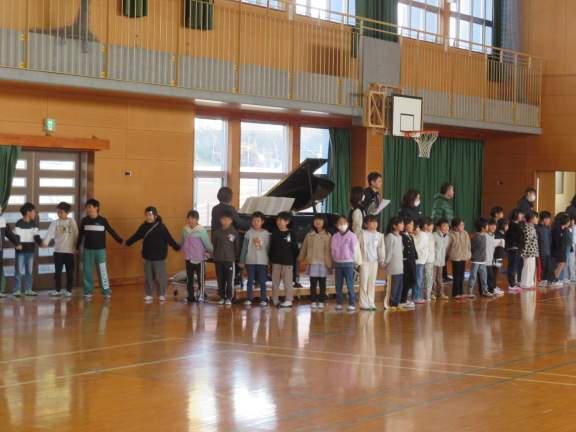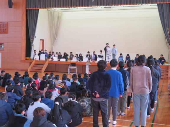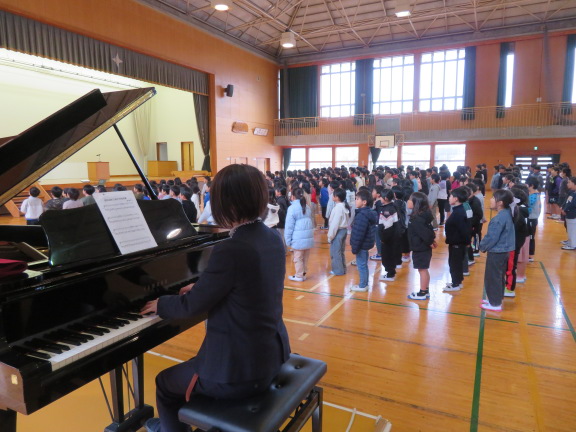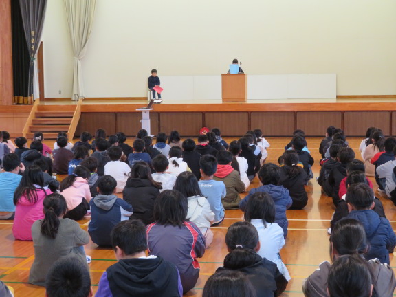 校長の話の後の児童代表の言葉では、2学期にがんばったことや楽しかったこと、3学期にがんばりたいことが述べられました。最後は、全校で校歌を斉唱しました。